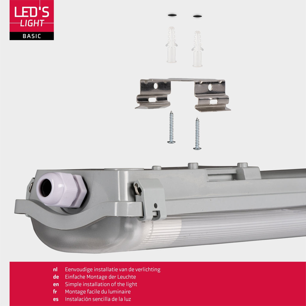 Dankzij het slimme ontwerp is de montage eenvoudig. Bevestig de armaturen met de meegeleverde ophangbeugels stevig aan wand of plafond. De LED buizen klik je eenvoudig op hun plek. Wil je meerdere armaturen koppelen? Met de doorverbindingoptie gaat dat moeiteloos.