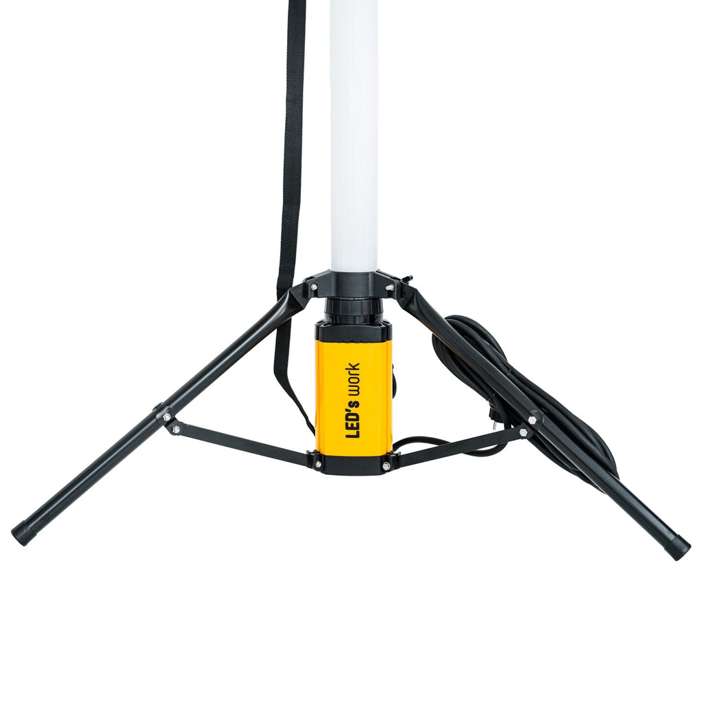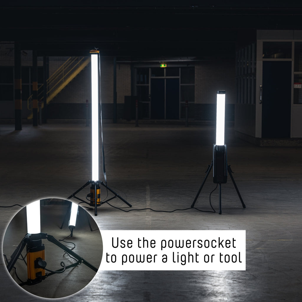 De LED torenlamp heeft een extra aansluiting voor het aansluiten van gereedschap en apparaten, waardoor er geen extra verlengsnoeren nodig zijn. De 5 m lange kabel is inbegrepen voor 230V-aansluiting. Het kabelbeheersysteem aan de poten van het statief zorgt voor een schone bekabeling en de inklapbare poten maken het efficiënt opbergen. Met de draagriem en textieltas is deze LED torenlamp gemakkelijk te vervoeren.