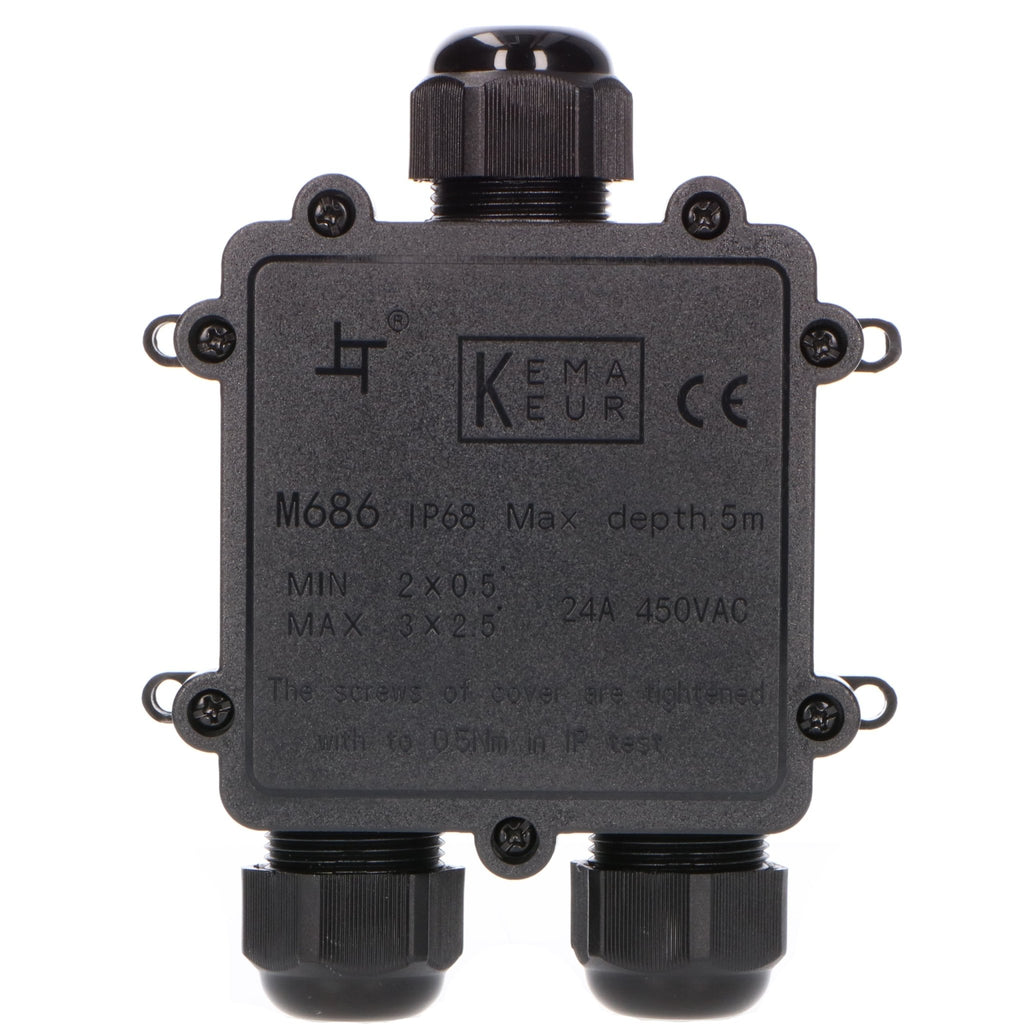 Deze T-connector kabeldoos is IP68-geclassificeerd, wat betekent dat hij volledig beschermd is tegen stof en water. Zelfs langdurig onderdompelen doet deze lasdoos niks. Je bent dus altijd verzekerd van een veilige elektrische verbinding.