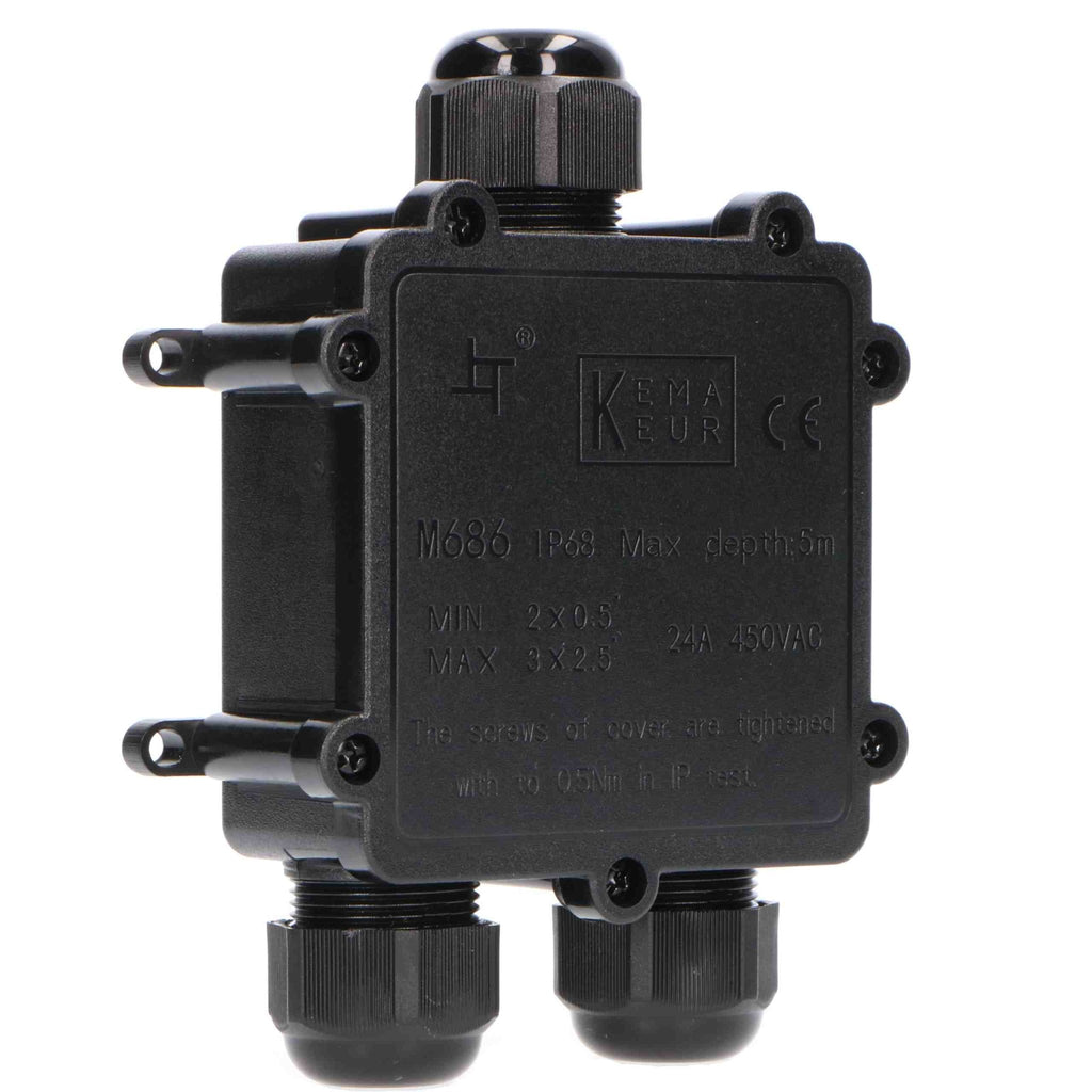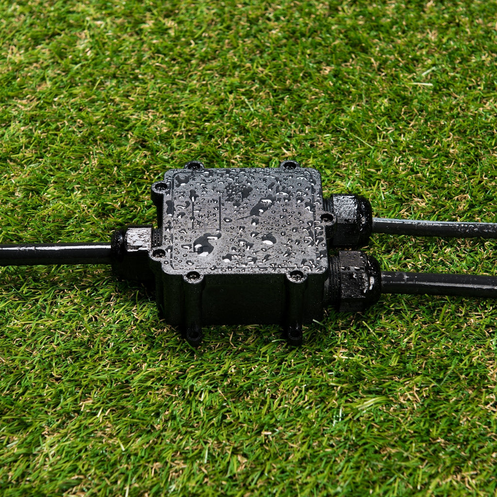 Dankzij deze T-connector kabeldoos, door sommigen ook wel lasdoos genoemd, sluit je je buitenlampen of andere elektra compleet waterdicht en netjes weggewerkt aan.